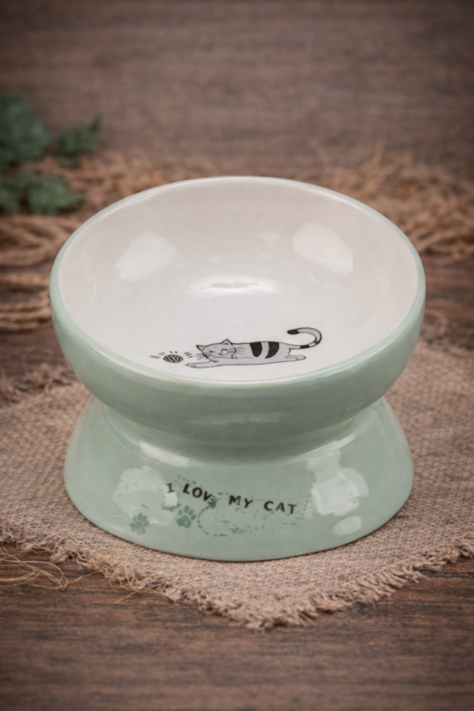 Miska podwyższona dla kota – ceramiczna, szałwiowa/biała Pojemność: 0,15 l | Średnica: 13 cm